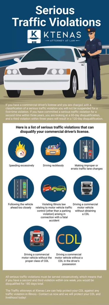 En Illinois, la descalificación de una CDL no depende de la cantidad de puntos en su registro, sino de la cantidad de infracciones de tránsito graves o importantes que tenga. Generalmente, sólo puede tener una infracción de tráfico grave en un plazo de tres años y conservar su CDL. Dos infracciones de tránsito graves (como exceso de velocidad) dentro de 3 años resultará en una descalificación de la CDL por 60 días. Comuníquese con nuestro abogado de boletos CDL de Chicago para discutir su caso de forma gratuita.